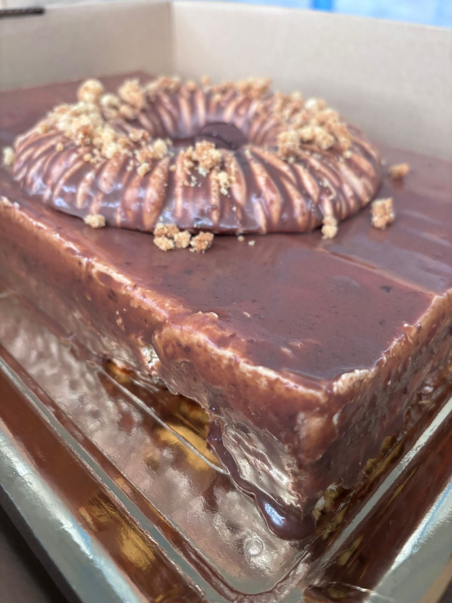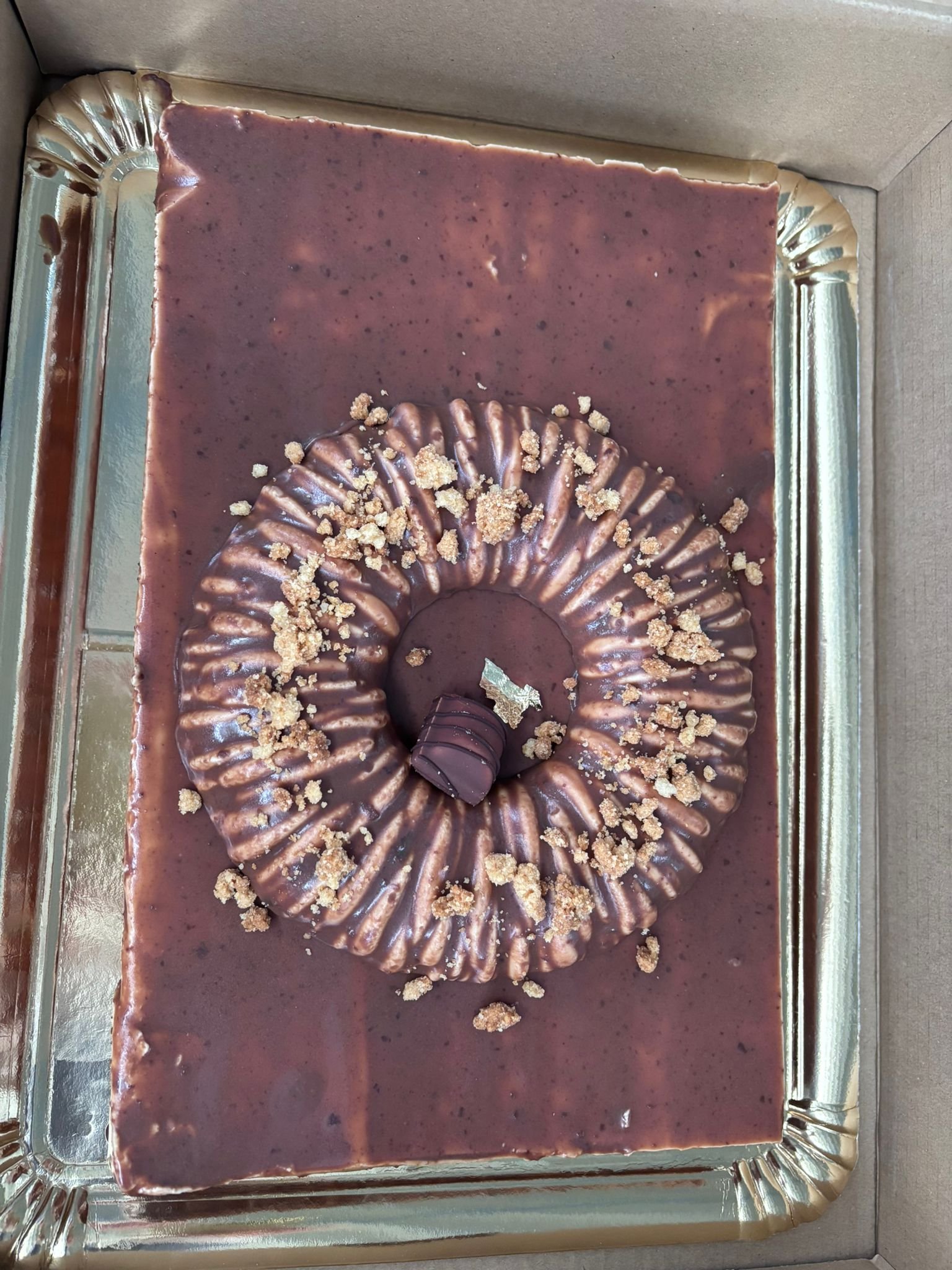 | Descripción | Tarta con capas crujientes, bizcocho de cacao y mousse de Kinder |